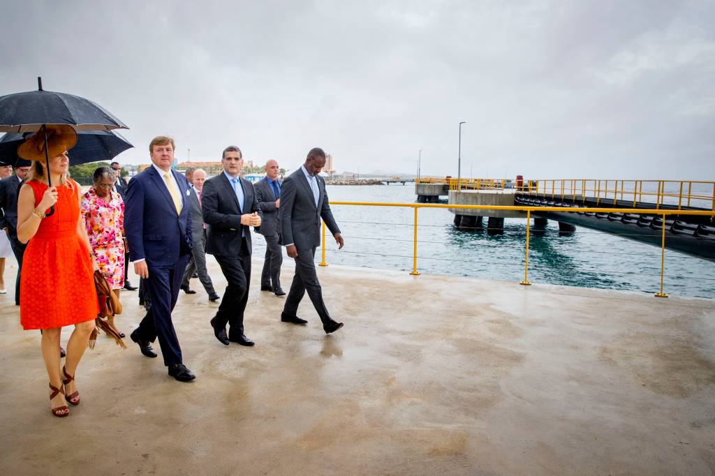 Het koningspaar, dat eerder zondagmiddag voor een tweedaags bezoek op Curaçao aankwam, bezocht na de pier ook Damen Shiprepair, dat net twee grote nieuwe doks heeft gekregen om schepen te repareren. Maandag wonen koning en koningen de festiviteiten bij ter gelegenheid van Dia di Bandera, die begint met het hijsen van de vlag van Curaçao op het Brionplein in Willemstad.