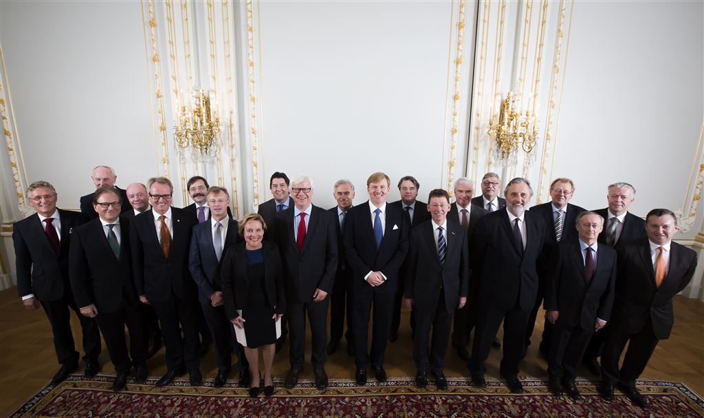 De Belgische gouverneurs bezoeken Nederland op uitnodiging van de Nederlandse kring van commissarissen van de koning. Zij spreken met elkaar over de overeenkomsten en verschillen tussen de Belgische en Nederlandse provincies. De koning en zijn gasten gingen in de Balzaal van Paleis Noordeinde met elkaar op de foto.