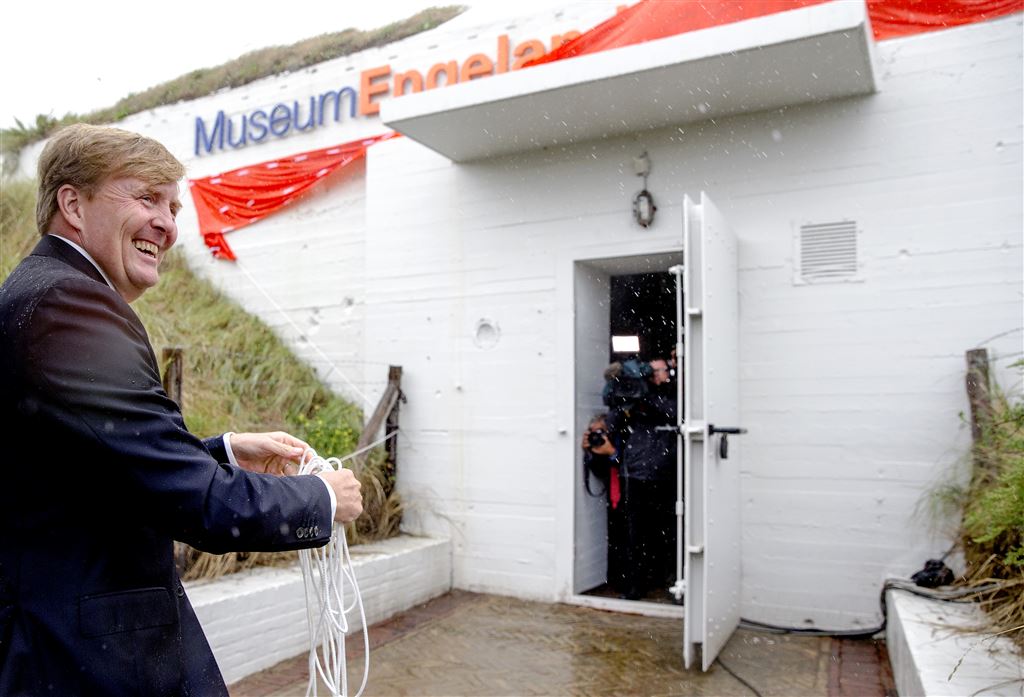 NOORDWIJK – Koning Willem-Alexander heeft vrijdagmiddag in Noordwijk een nat pak opgelopen bij de opening van het nieuwe Museum Engelandvaarders in een voormalige Duitse bunker. Het stortregende op het moment dat hij met de 94-jarige Engelandvaarder Eddie Jonker het doek voor de naam van het museum in de Noordwijkse duinenrij wegtrok.