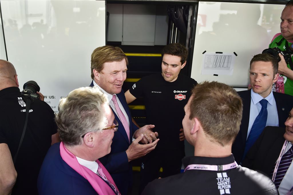 Willem-Alexander liep in het rennerskwartier langs een aantal teambussen. Bij de bus van Giant-Alpecin, de ploeg van Maastrichtenaar Dumoulin, schudde hij de tijdritspecialist de hand. Dumoulin geldt als een van de topfavorieten voor de roze trui. De koning sprak verder met teammanager Iwan Spekenbrink van Giant-Alpecin. Ook bezocht hij de teams van LottoNL-Jumbo en Astana.