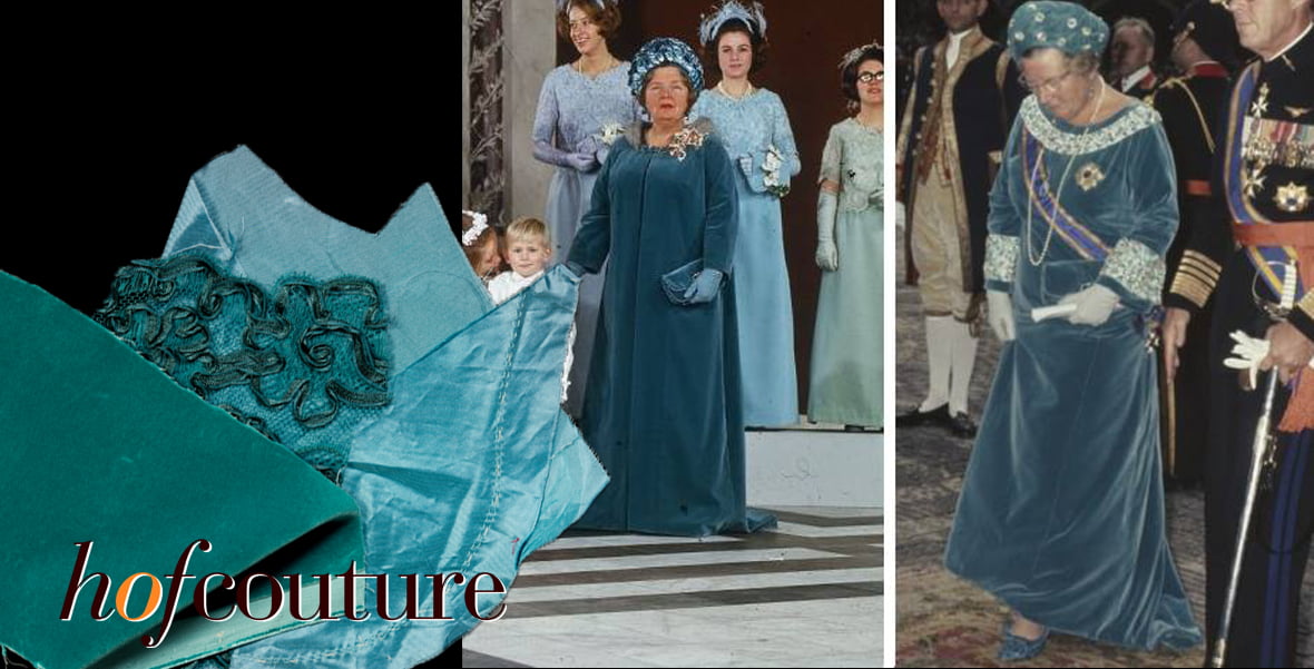 December is een maand om vooruit te kijken, maar ook terugblikken doen we graag. Op bijzondere koninklijke mode bijvoorbeeld. Gisteren zag u een groene japon met rijk geborduurd lijfje, door prinses Beatrix gedragen in 1972 en 1975. Vandaag kijken we naar de japon die koningin Juliana droeg tijdens Prinsjesdag 1968. De turkooizen japon van zijdefluweel is een ontwerp van Maison Linette en is versierd met kralen en pailletten.