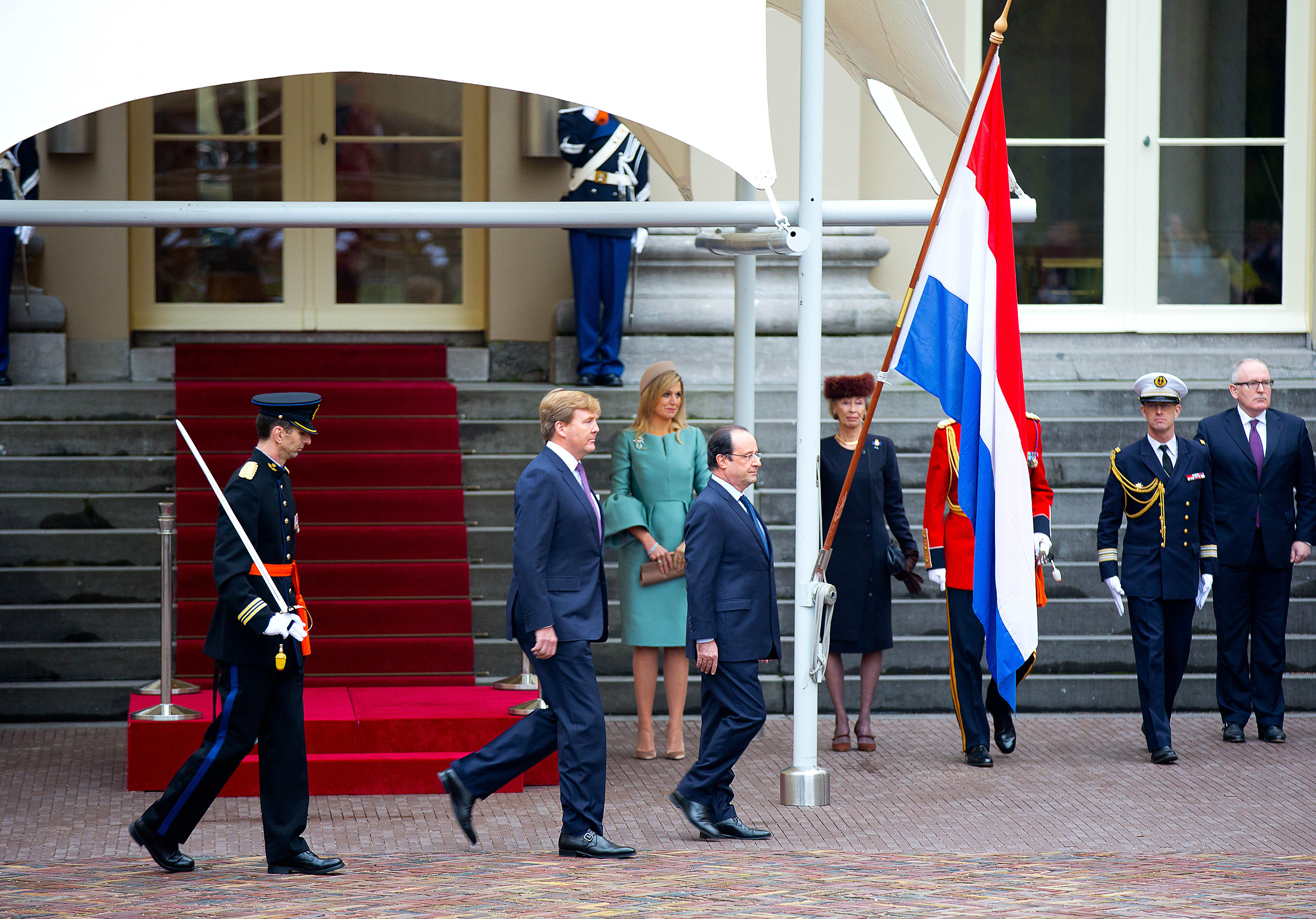 Voor de ontvangst van de Franse president verscheen koningin Máxima vanmorgen in een bekende japon van modehuis NATAN. De groen/blauwe creatie zagen we eerder tijdens de viering van 200 jaar Koninkrijk, maar ditmaal in combinatie met los haar en de aquamarijnen uit de kluis van de koninklijke familie. Welke look vindt u mooier?