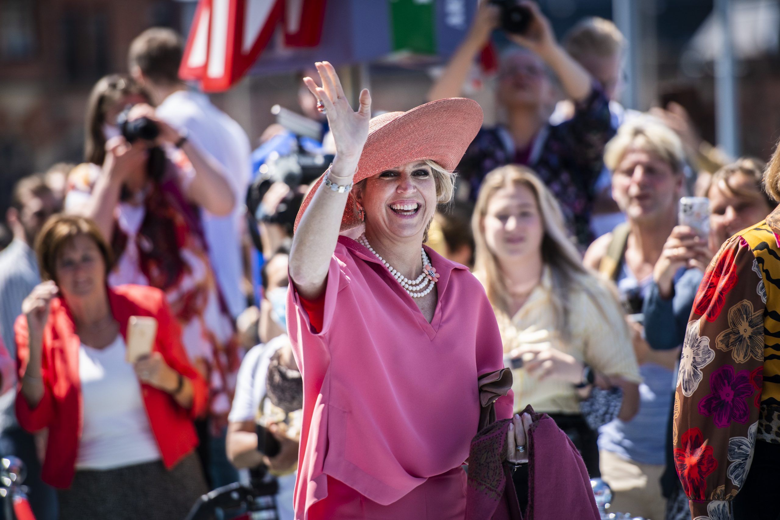 Op een video, die het museum deelt, arriveert Máxima samen met de Groningse burgemeester bij het museum. Ze is volledig gehuld in het knalroze, zowel haar pak als haar hoed sprong in deze kleur eruit.