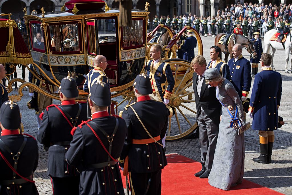Koning Willem-Alexander draagt een jacquet met grijs vest met het draaginsigne Ridder Militaire Willems-Orde.