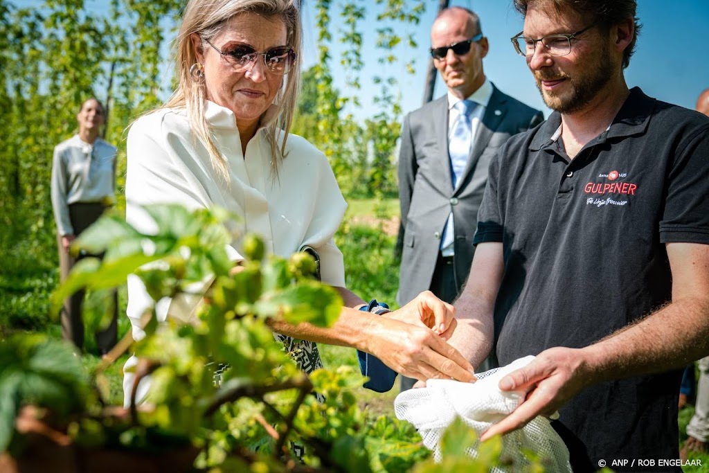 Koningin Máxima heeft donderdag tijdens haar bezoek aan de Gulpener Bierbrouwerij in Limburg de handen uit de mouwen gestoken. De vorstin mocht hopbellen plukken en hielp ook een handje mee in de microbrouwerij, waar de eerder geplukte planten werden gebruikt voor het uitproberen van nieuwe bieren en smaken.