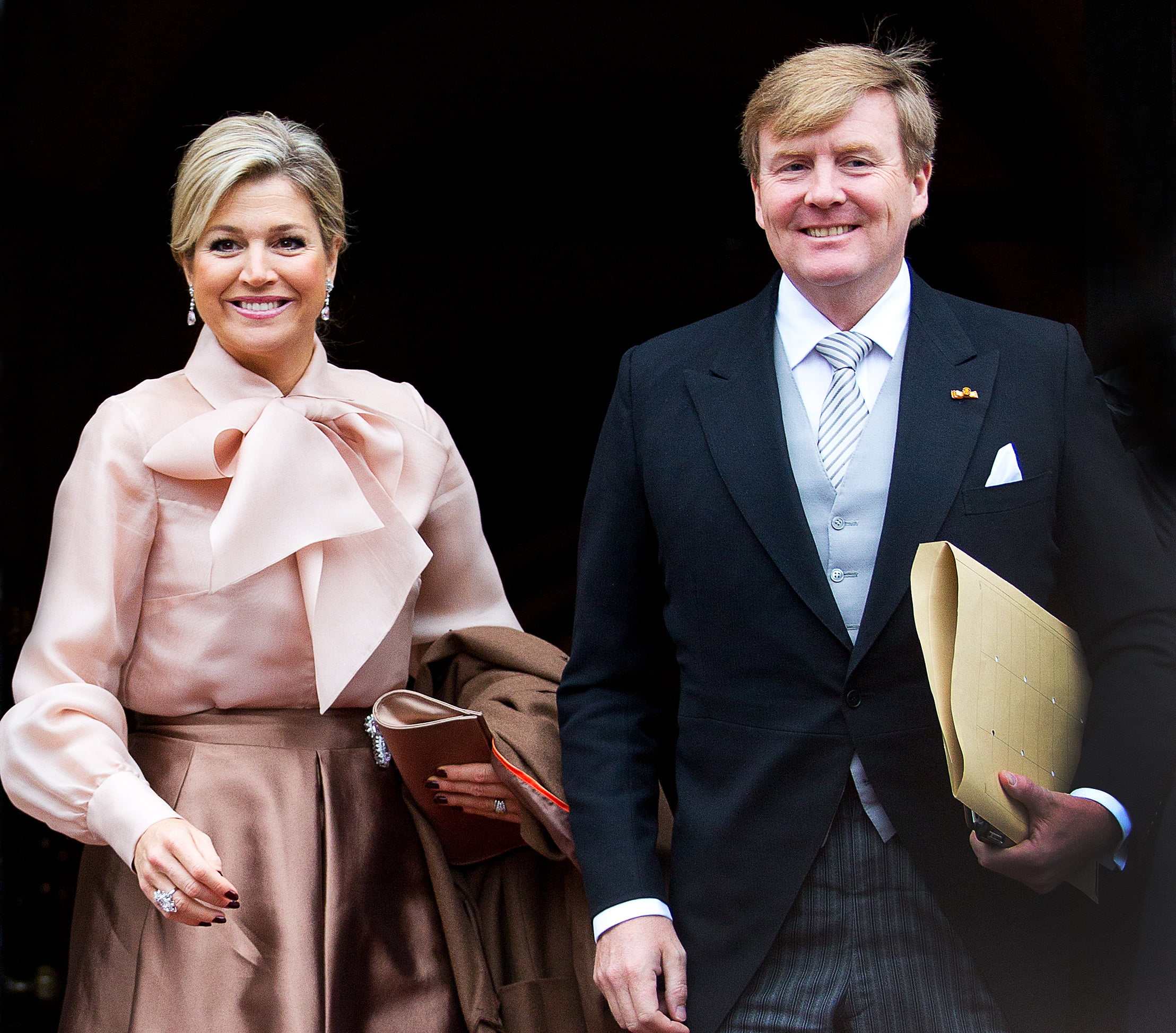 Voor de tweede nieuwjaarsreceptie van 2014 koos koningin Máxima vandaag opnieuw voor een outfit van modehuis NATAN. Ditmaal geen hippe broek, maar een klassieke bruine midi-rok, gecombineerd met een lichtroze blouse met opvallende strikapplicatie. Het is niet de eerste keer dat Máxima kiest voor deze look, want ook tijdens het kennismakingsbezoek aan Zweden in 2013 verscheen de in deze kleding uit de wintercollectie van NATAN. Nieuw is wel de combinatie met de broche van kunziet, die door zowel Beatrix als Máxima regelmatig wordt gedragen.