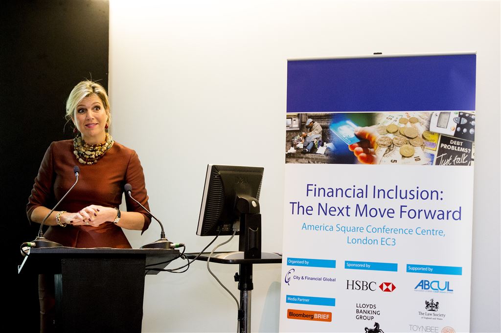 De koningin was in Londen uitgenodigd als expert op het gebied van betere toegankelijkheid van financiële diensten. Ook in een land als Groot-Brittannië zijn er nog altijd twee miljoen mensen die geen bankrekening hebben en geen toegang hebben tot zaken als verzekeringen, leningen of spaarrekeningen. Wereldwijd zijn dat 2,5 miljard mensen.