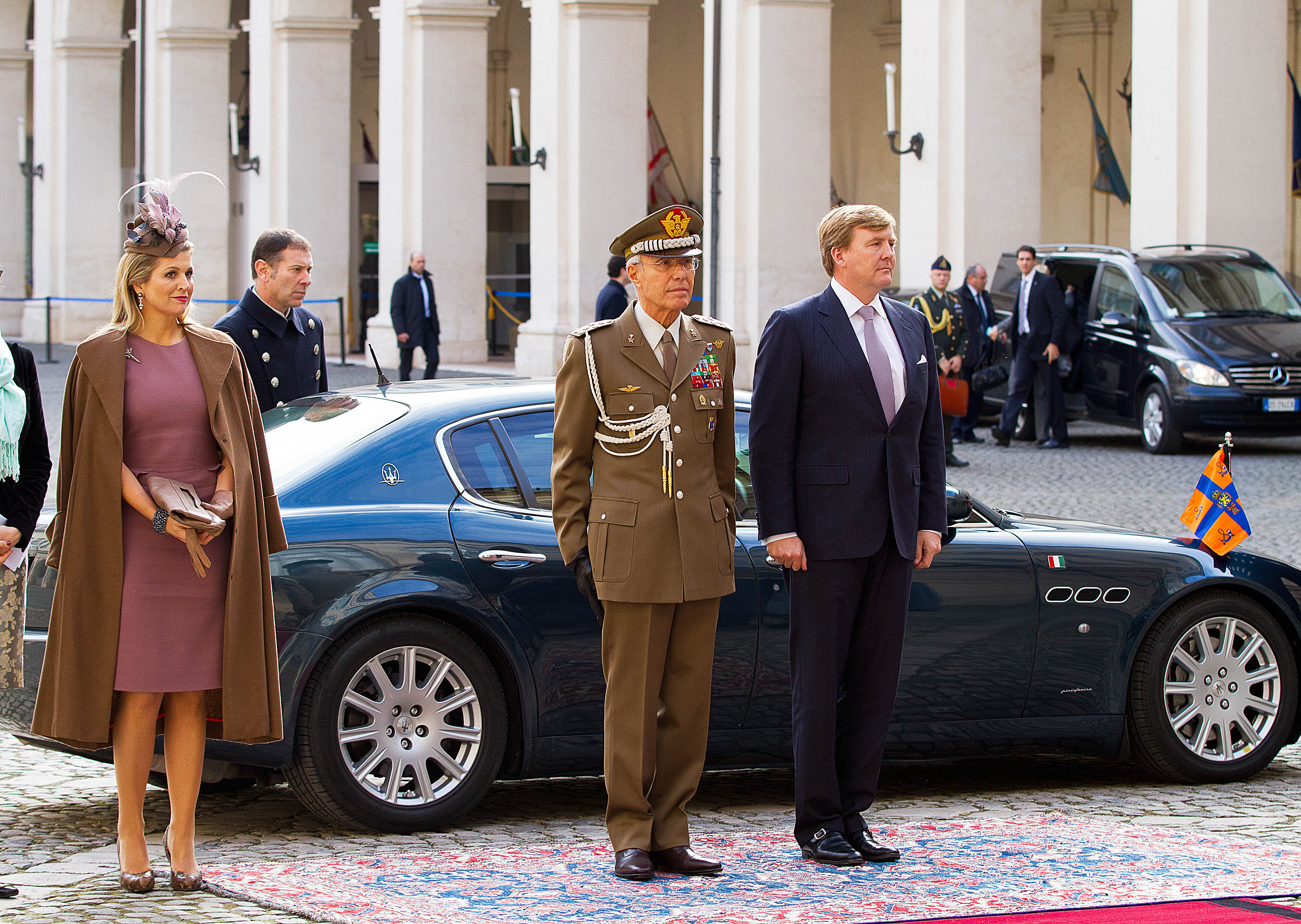 Koningin Máxima weet ons iedere keer opnieuw weer te verrassen met haar kleding en accessoires. Ook gisteren was dat het geval tijdens het kennismakingsbezoek aan Italië. Voor de gelegenheid verscheen de koningin in een japon van modehuis Bottega Veneta, gecombineerd met een hoed mét vogeltje. Om de look af te maken koos Máxima verder nog voor schoenen van het bekende merk LK Bennett en een bijzondere broche uit de kluis van de koninklijke familie. We zijn heel benieuwd wat u van het opvallende totaalplaatje vindt!