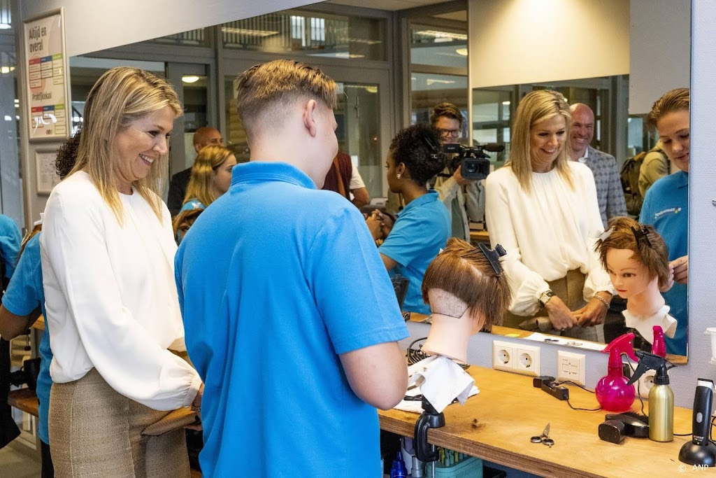 De kapsalon vormde de eerste stop, waar leerlingen – totaal overrompeld door het bijzondere bezoek – op dat moment op een pop aan het oefenen waren om haar in te vlechten en highlights te zetten. Wat vinden ze eigenlijk zo leuk aan dit vak?, wilde Máxima van ze weten. “Ik vind het leuk om mensen mooi te maken”, zei een van de leerlingen. Bij de manicure liet de koningin de kans niet schieten haar nagels te laten vijlen.