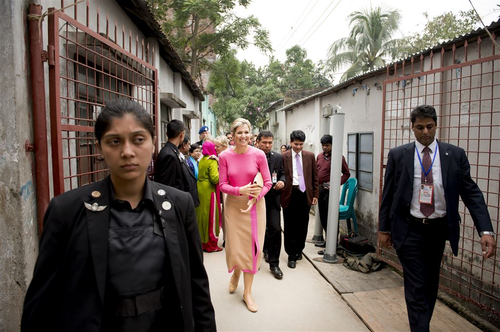DHAKA – Koningin Máxima heeft dinsdag met een reeks besprekingen de tweede dag van haar VN-werkbezoek aan Bangladesh afgesloten. Na het enerverende veldbezoek in de ochtend volgde na een korte pauze een visite aan de gouverneur van de nationale bank en daarna een gesprek over de opzet van een nationale strategie voor het beter toegankelijk maken van digitale financiële diensten in het Zuid-Aziatische land. Ook ontving de koningin de CEO’s van Grameenphone en bKash, die beiden actief zijn op dat gebied.