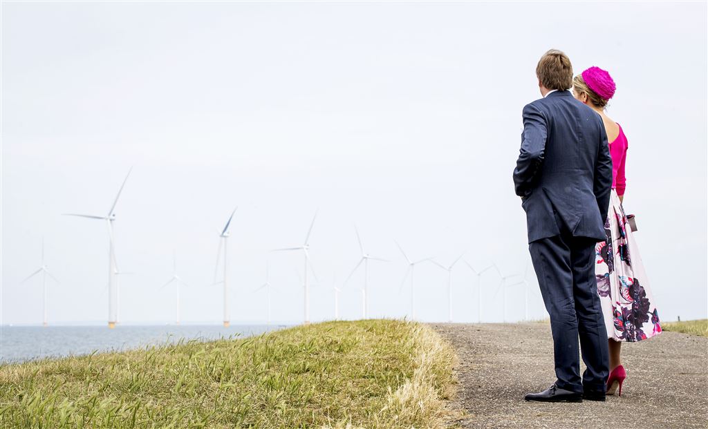 Koning Willem-Alexander en koningin Máxima hebben donderdagmorgen tijdens hun streekbezoek aan het noordoosten van de provincie Flevoland een kijkje genomen bij het tien dagen geleden geopende Windpark. Op de dijk poseerden ze met de enorme, hypermoderne windturbines op de achtergrond.