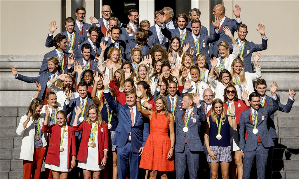 Máxima, in oranje jurk, en Willem-Alexander, met oranje stropdas, poseerden met alle medaillewinnaars op het bordes. De acht sporters die een gouden plak in de wacht sleepten, werden eerder in de Ridderzaal koninklijk onderscheiden. Dorian van Rijsselberghe, die vier jaar geleden al werd geridderd nadat hij goud had gewonnen in Londen, kreeg een beeldje.