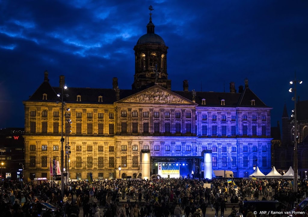 “Koninklijk Paleis Amsterdam kleurt geel/blauw vanavond”, is op de Twitterpagina van het officiële ontvangstpaleis te lezen, “#AmsterdamWithUkraine @AmsterdamNL #solidair”. Ook zijn twee foto’s gedeeld, waarop niet alleen het paleis in blauw en geel licht te zien is, maar ook een mensenmassa voor het paleis.
