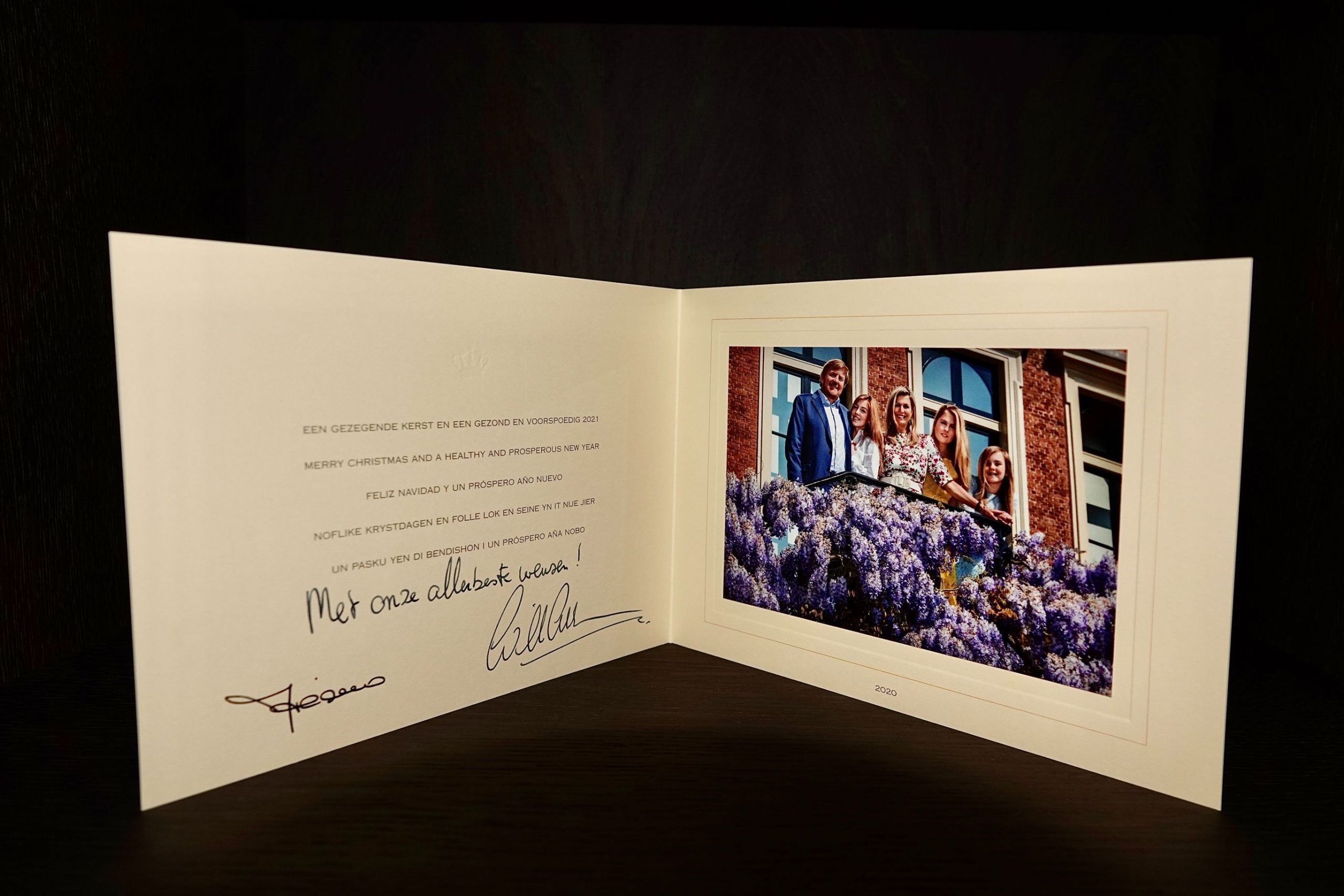 Op het kiekje poseert het koningspaar met hun drie dochters op het balkon van Paleis Huis ten Bosch. “Een gezegende kerst en een gezond en voorspoedig 2021. Met onze allerbeste wensen”, staat erbij geschreven. De familie deelde de gelukswensen behalve in het Nederlands ook in het Engels, Spaans, Fries en Papiaments.