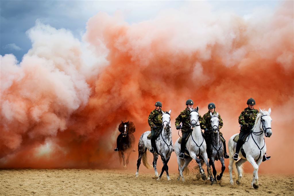 Leden van de Cavalerie Ere-Escorte hebben maandag op het strand van Scheveningen geoefend voor Prinsjesdag. Traditiegetrouw werden de paarden en hun ruiters op de dag voor Prinsjesdag aan een laatste test onderworpen. Tijdens de spectaculaire oefening werden de paarden met geweervuur, kanonslagen, rookbommen, muziek en geschreeuw op allerlei mogelijke scenario’s voorbereid.