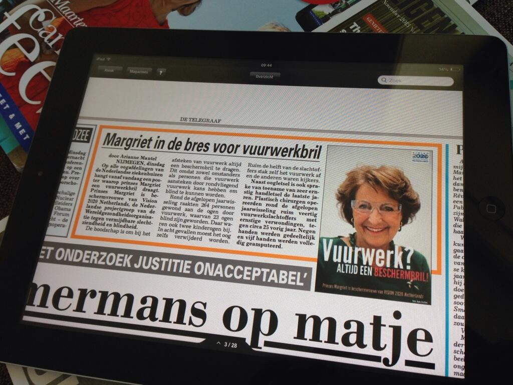 AMSTERDAM – Prinses Margriet spoort mensen die vuurwerk afsteken aan om daarbij altijd een beschermende bril te dragen, meldt De Telegraaf. Zij is met een vuurwerkbril afgebeeld op een poster die vanaf dinsdag op de oogafdelingen van ziekenhuizen hangt, met de tekst: ‘Vuurwerk? Altijd een beschermbril!’
