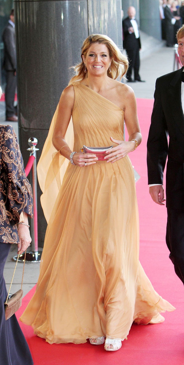 In een zwierige off-shoulder jurk van chiffon arriveerde een stralende prinses Máxima vrijdagavond 27 mei bij het Concertgebouw in Amsterdam voor een speciaal verjaardagsconcert. Familie (onder wie ook de Zorreguieta’s), vrienden, leden van buitenlandse koningshuizen en mensen met wie Máxima de afgelopen tien jaar heeft samengewerkt woonden het concert bij. En niet koningin Beatrix maar de jarige Máxima mocht nu als eerste de rode loper betreden. In haar dankwoord na afloop van het concert richtte Máxima zich nog speciaal tot haar schoonmoeder. ‘Dank dat ik samen met Alexander en u een team mag vormen. Jullie zijn mijn beste leraren geweest. Uw onverdeelde steun laat zien wat een goede moeder u voor mij bent.’