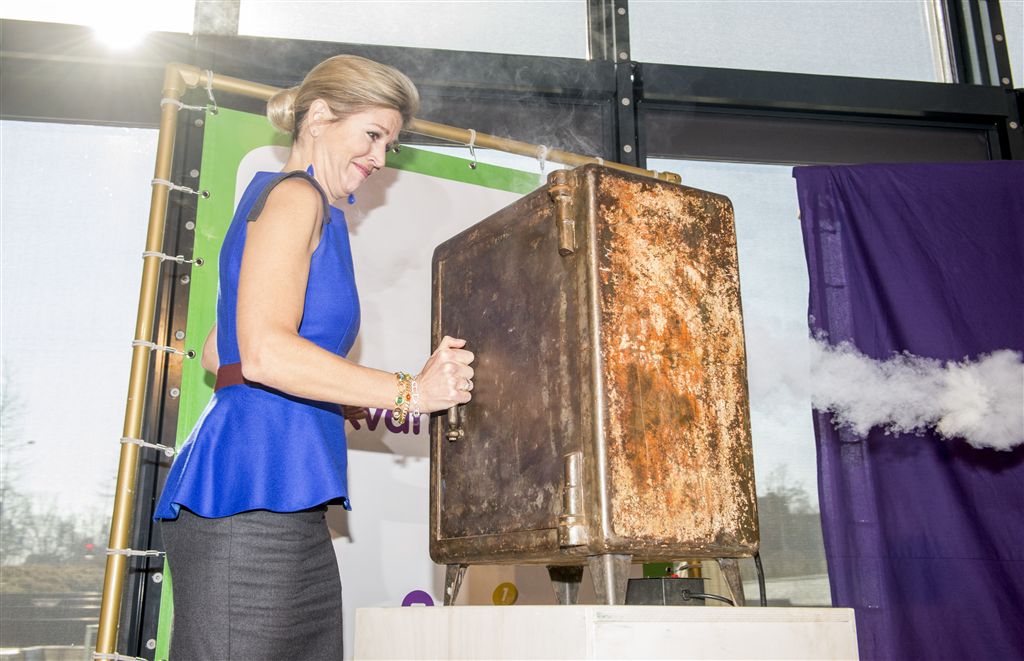 HILVERSUM – Koningin Máxima heeft maandagochtend in Hilversum de Week van het geld 2014 geopend. De koningin opende de themaweek door de deur van een stomende kluis dicht te slaan, waarna een doek met de tekst Week van het geld tevoorschijn kwam.Tijdens het openingsevenement in het Nederlands Instituut voor Beeld en Geluid vond de finale plaats van de scholenwedstrijd De Gelduitdaging. Afgelopen najaar gingen kinderen uit groep 8 aan de slag met eigen projecten om geld te verdienen. Tijdens de finale presenteerden de finalisten van de scholencompetitie hun aanpak en de resultaten van hun projecten, waarna de jury de Kluinveenschool uit Wierden tot winnaar uitriep. Deze school kreeg een cheque voor een reis naar Zwitserland en de stichting Heppie.