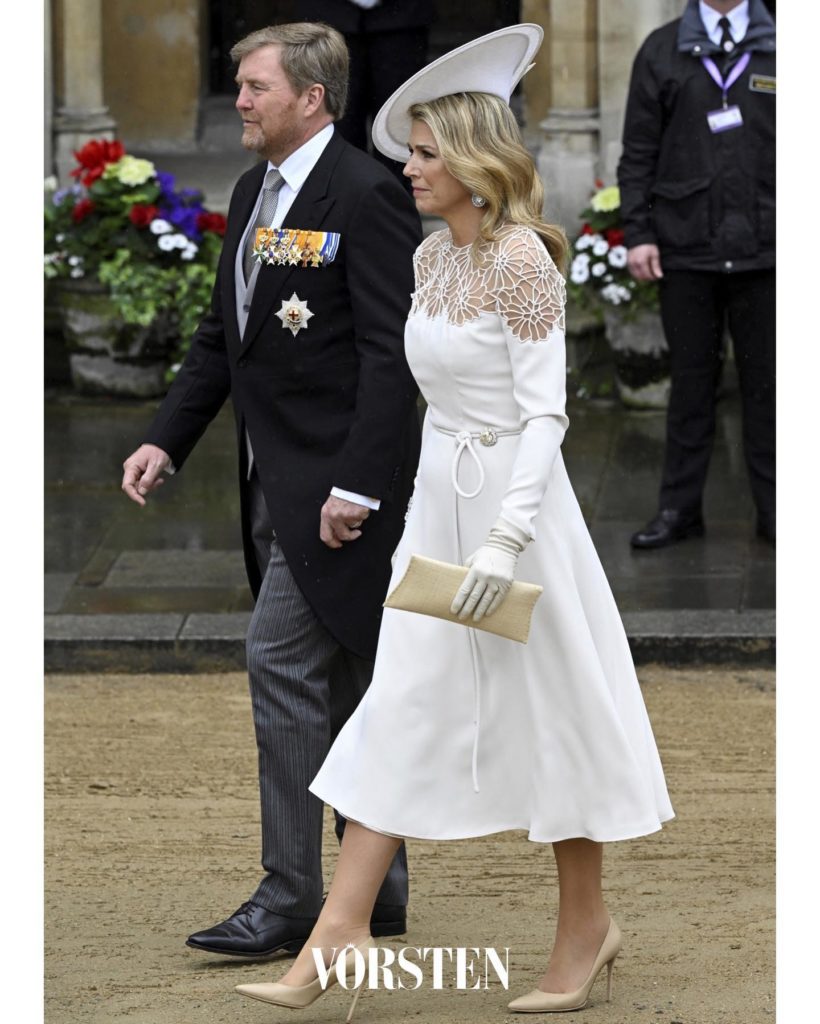 Koningin Máxima draagt zaterdag bij de kroning van koning Charles zowel een Nederlands als een Brits ontwerp. De japon is van Jan Taminiau en de hoed is een ontwerp van de Britse hoedenmaker Philip Treacy.