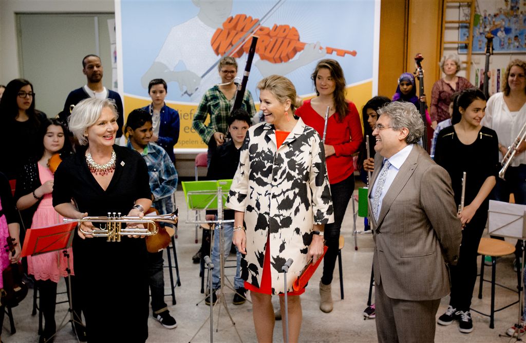 DEN HAAG – Koningin Máxima heeft maandagochtend op basisschool ’t Palet in de Haagse Schilderswijk het startschot gegeven voor de inzamelingsactie van instrumenten voor muziekonderwijs aan kinderen. De actie is een initiatief van het programma Radio 4 Klassiek Geeft en het landelijk Instrumentendepot Leerorkest. Doel is om zoveel mogelijk kinderen in Nederland de kans te geven een muziekinstrument te leren bespelen. Marco de Souza, initiatiefnemer van het Instrumentendepot, nam uit handen van de koningin het eerste instrument, een trompet, in ontvangst.