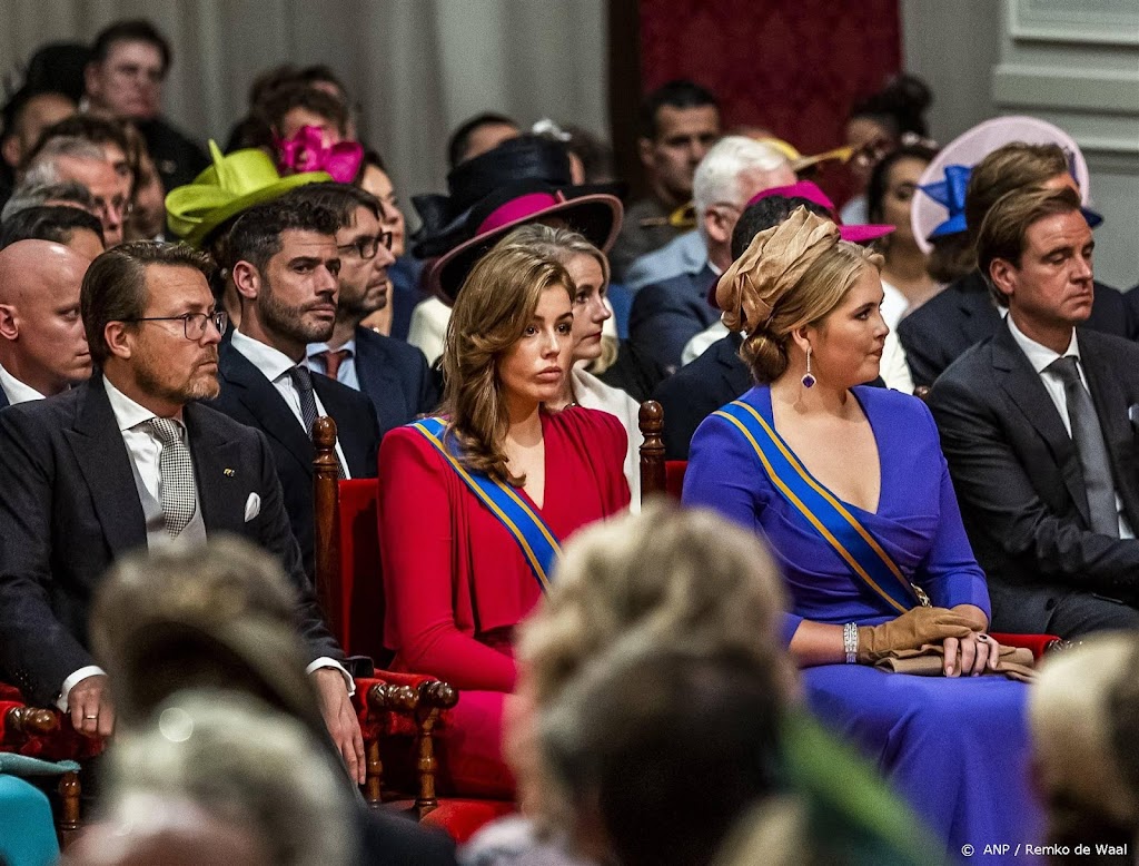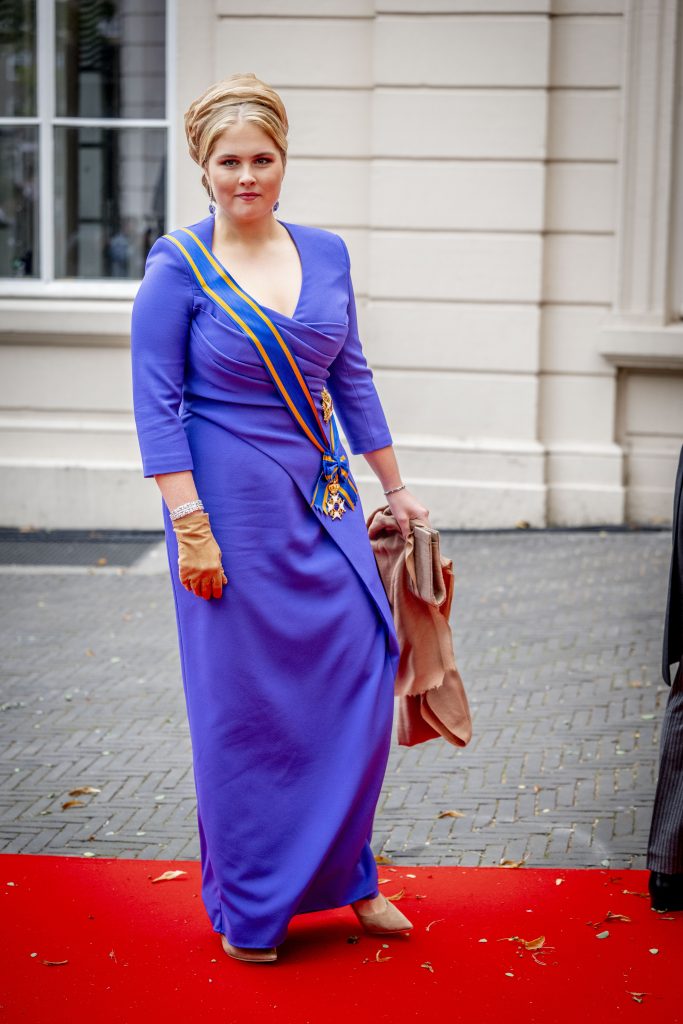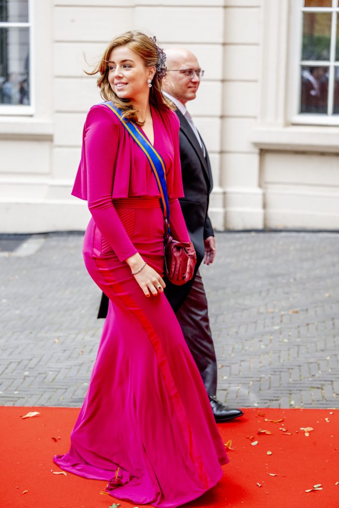 De 19-jarige prinses Amalia draagt een lange lavendelpaarse japon met een schuine halslijn van Safiyaa. Voor haar hoedje is ze in de kast van haar moeder gedoken. De 18-jarige prinses Alexia, die deze Prinsjesdag voor het eerst aanwezig was, heeft een lange fuchsia japon van ontwerper Zhivago aan.