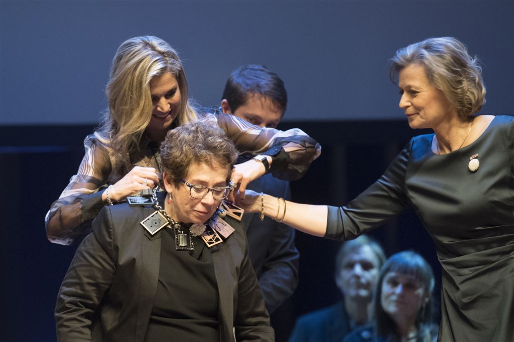 Koningin Máxima heeft documentairemaker Heddy Honigmann vrijdagmiddag onderscheiden met de Prins Bernhard Cultuurfonds Prijs 2016. Dat deed ze tijdens een feestelijke ceremonie in het Muziekgebouw aan ’t IJ in Amsterdam. De koningin mocht de bijbehorende ketting om Honigmanns hals hangen.