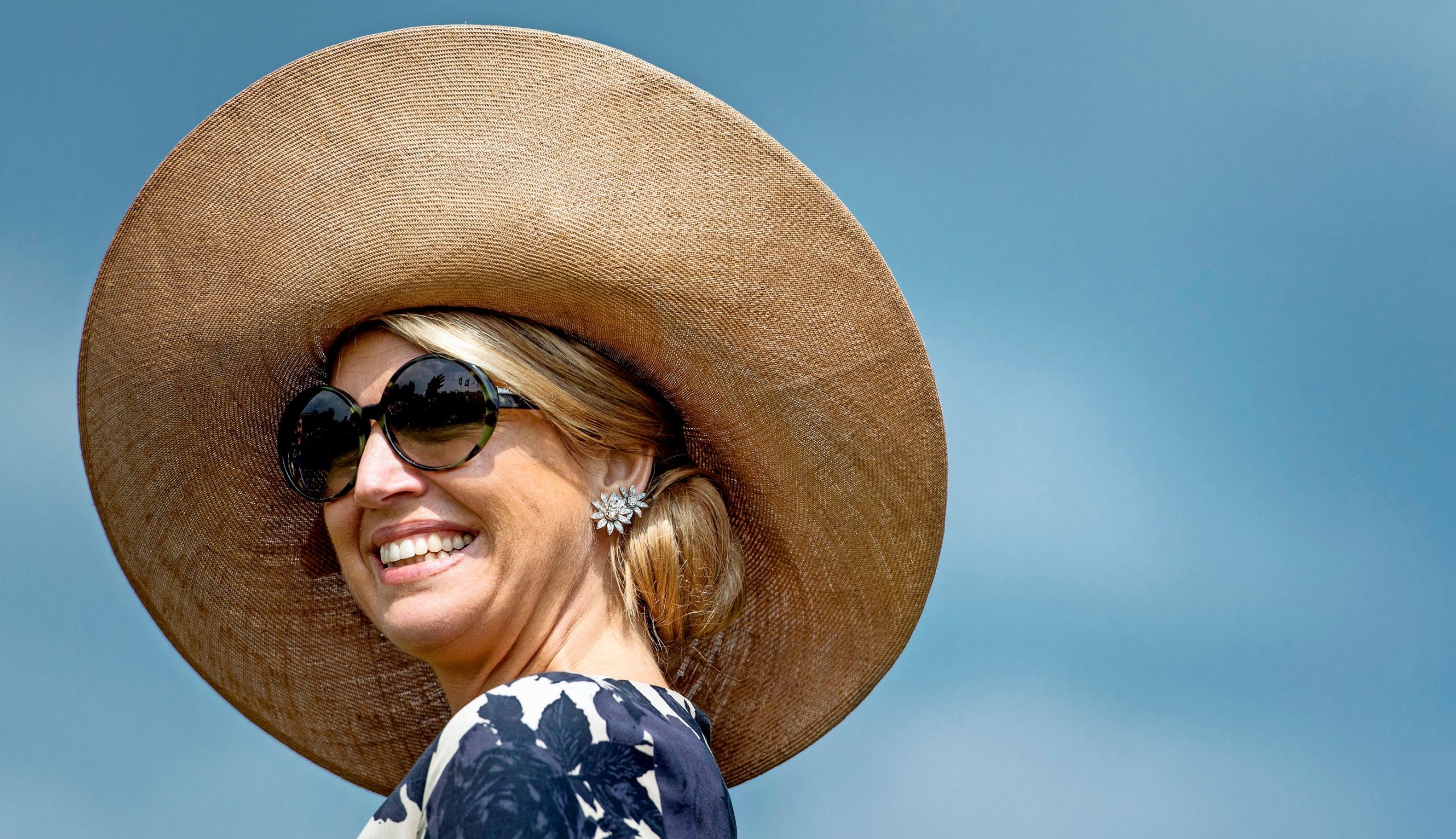 De basis van de breedgerande hoed draagt Máxima nu achterstevoren als dophoedje