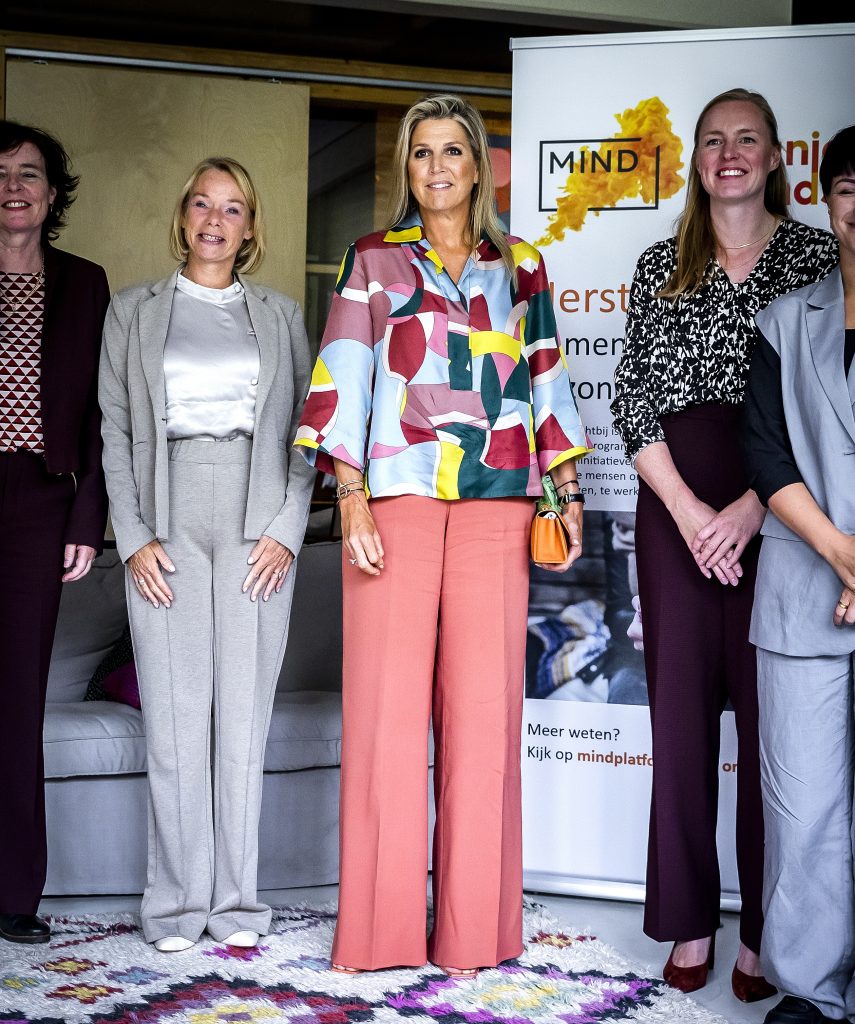 Met wel een heel bijzonder accessoire bezocht Máxima stichiting MindUS. Op haar clutch zit een kikker in yoga-houding.