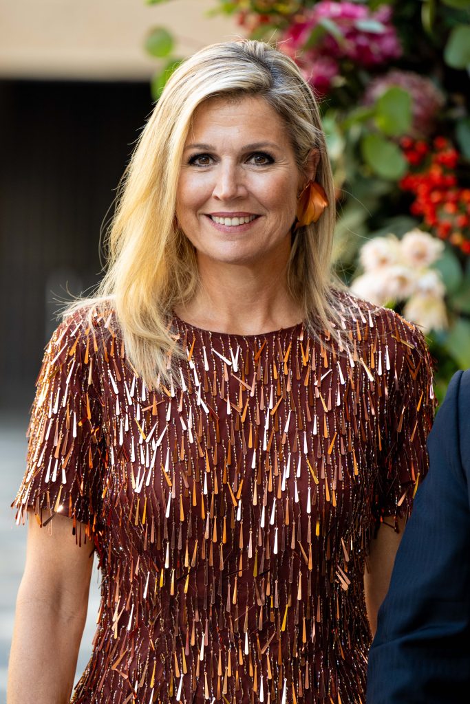 In een mouwloos jurkje met een bescheiden vestje ontvangt Máxima met Willem-Alexander de gasten voor de Uitblinkerslunch op Paleis Noordeinde.