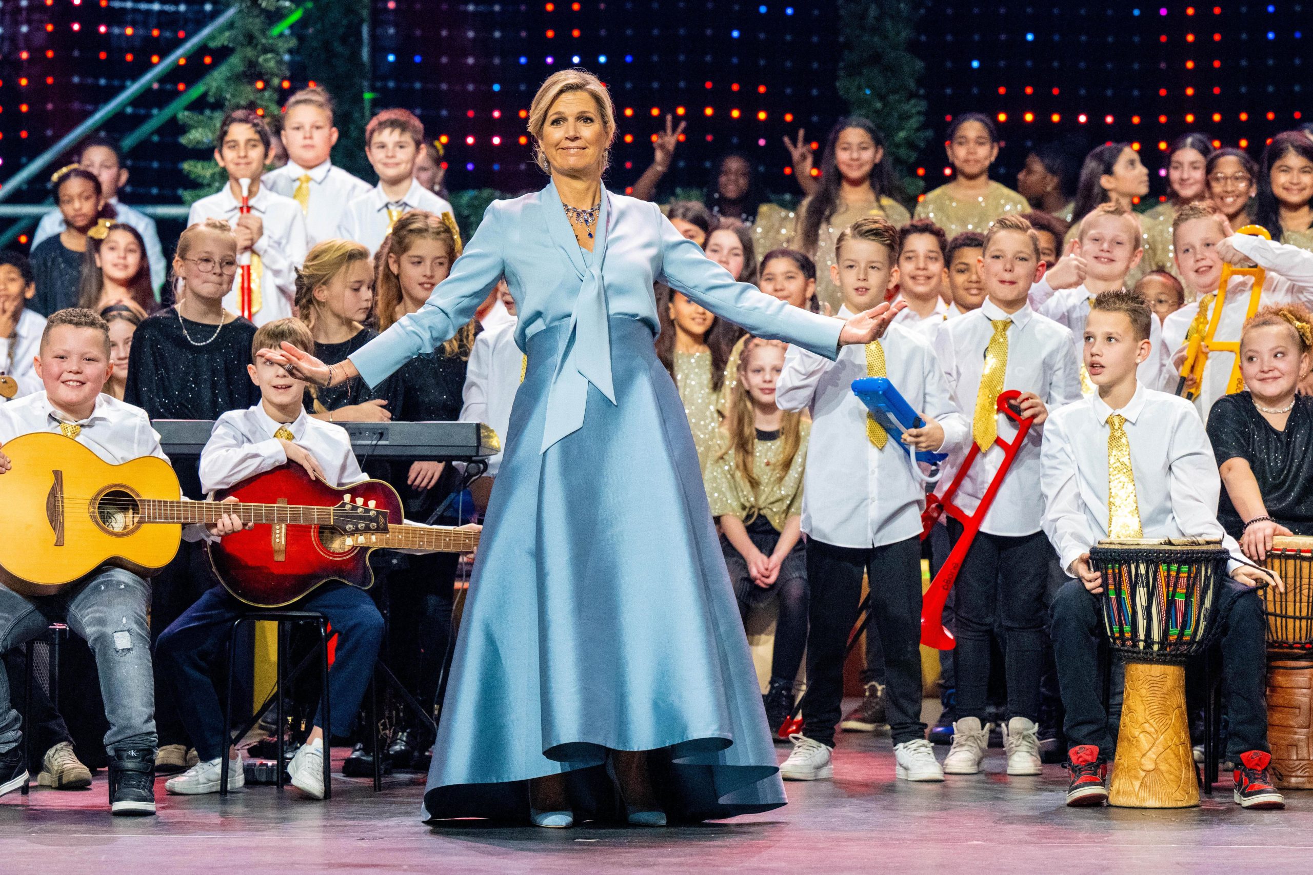 Door de hoeveelheid stof lijkt het net alsof de top van Natan voorzien is van een cape. De koningin draagt haar nieuwe set naar een basisschool in Den Haag voor Méér Muziek in de Klas.