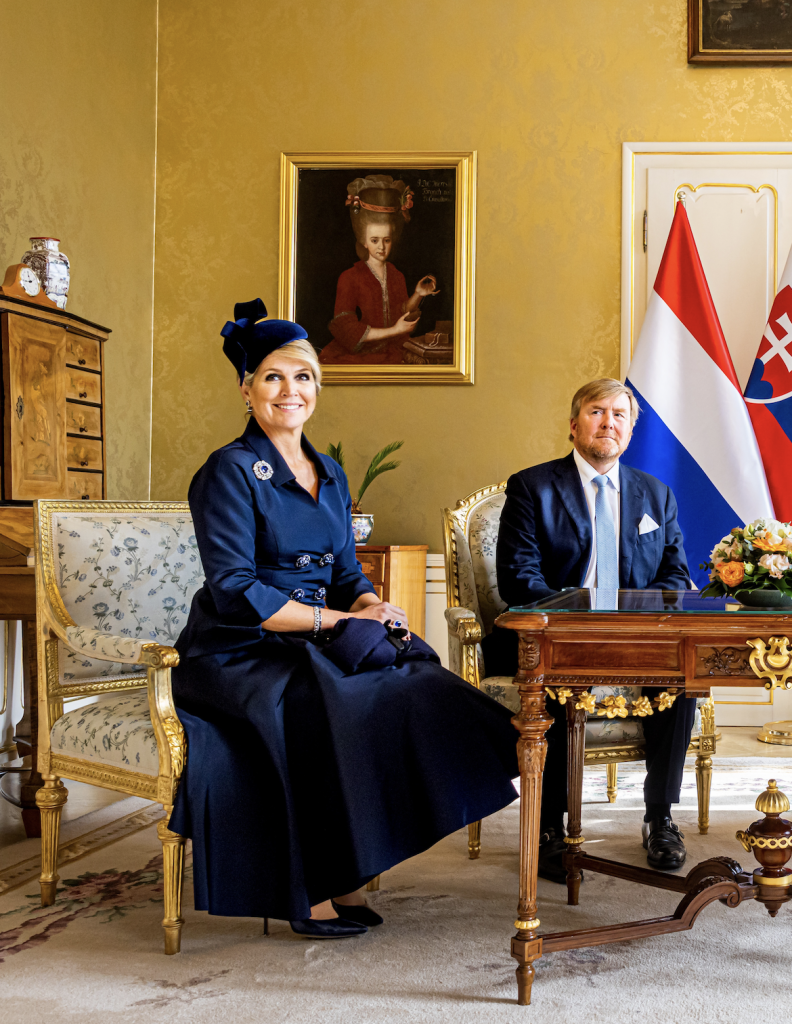 Máxima start het staatsbezoek aan Slowakije in maart in een nieuwe donkerblauwe jurk van Natan.