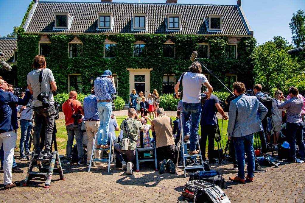 Een aantal fotografen was in de zomerse hitte duidelijk de tel kwijt geraakt. “Nog één keer naar rechts”, “nog één keer naar het midden”, “nog één keer hier kijken” klonk het uit dezelfde monden wel tientallen keren heel indringend en dwingend. “Mag het misschien ook een keer naar links”, smeekte een collega die zich verderop had opgesteld, maar nog voor koning, koningin en prinsessen aan die oproep gehoor hadden gegeven schalde het ‘nog één keer naar rechts’ over het voorplein van de Eikenhorst.