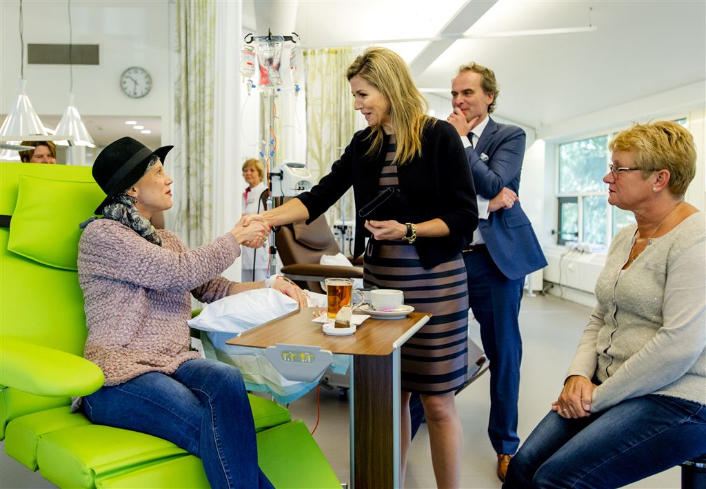 BILTHOVEN – Voor een aantal patiënten van het Alexander Monro borstkankerziekenhuis in Bilthoven verliep dinsdagmorgen iets anders dan verwacht. Máxima kwam op werkbezoek en dat betekende dat de koningin opeens aan bed verscheen, en kwam praten met vrouwen die chemotherapie ondergingen. Dat werden meteen hartelijke, maar ook emotionele gesprekken.