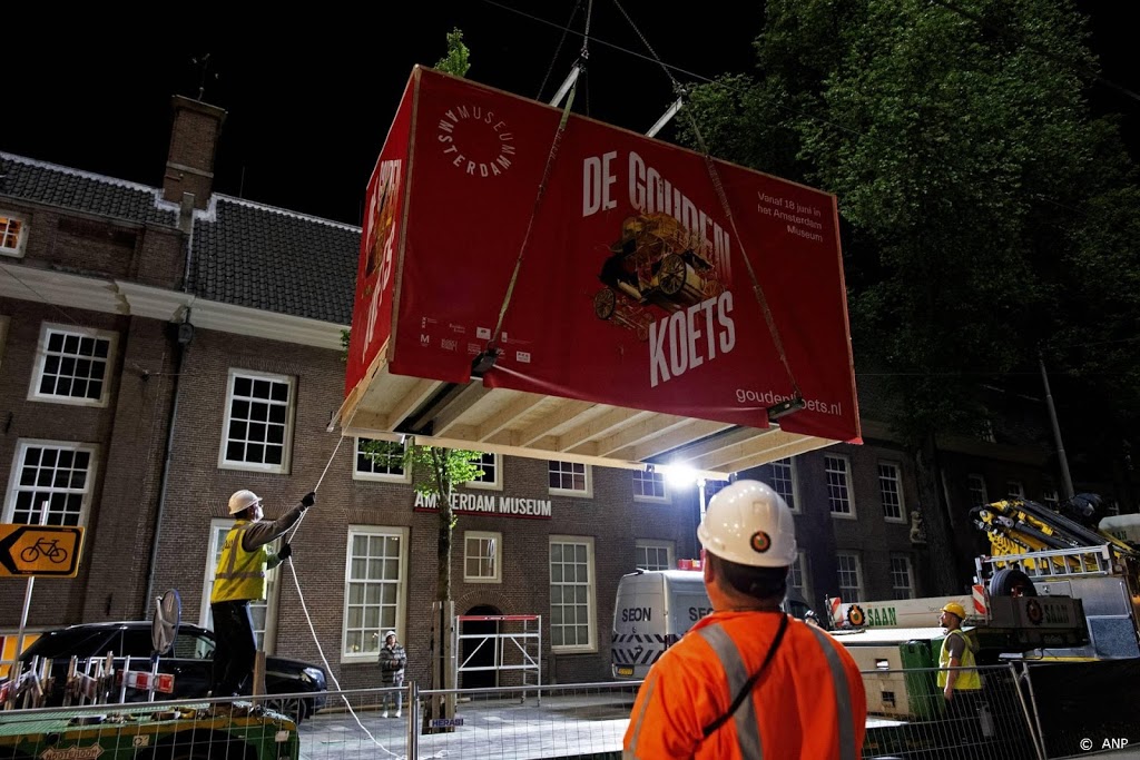 De Gouden Koets is binnen. Bij het Amsterdam Museum is het aftellen tot de koninklijke opening van de bijzondere expositie over het iconische rijtuig donderdagochtend in alle vroegte begonnen. “De tentoonstelling is bijna af. Vrijdag moet alles klaar zijn”, aldus museumdirecteur Judikje Kiers, die het naar binnen takelen van de uit Den Haag overgebrachte koets gade heeft geslagen.