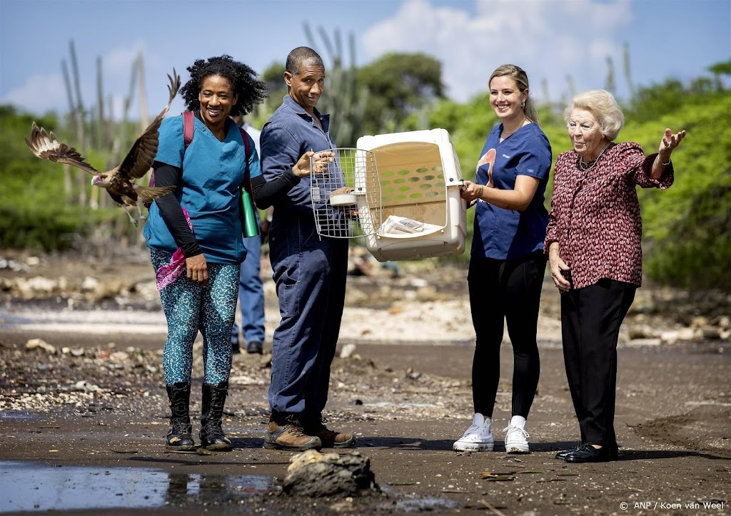 Prinses Beatrix heeft woensdagochtend een warawara vrijgelaten in de natuur bij haar bezoek aan het natuurgebied Rif St. Marie-Hermanus in Curaçao. “Joepie”, riep de prinses toen de roofvogel wegvloog.