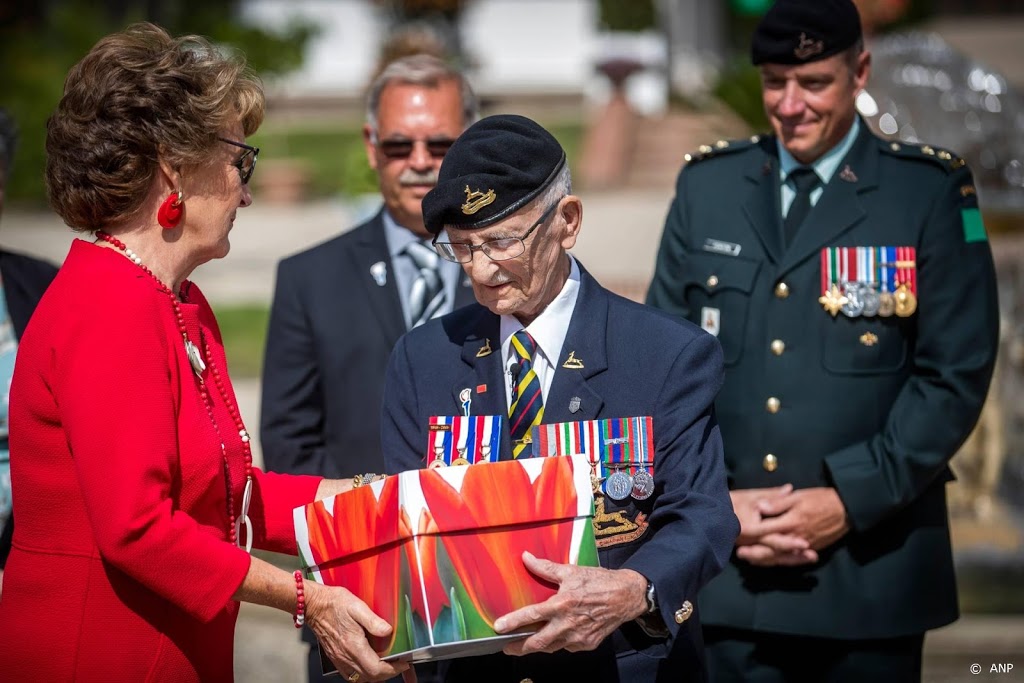 In het kader van 75 jaar vrijheid heeft prinses Margriet maandag op Paleis het Loo een aantal tulpenbollen aan de Canadese veteraan Don White overhandigd.