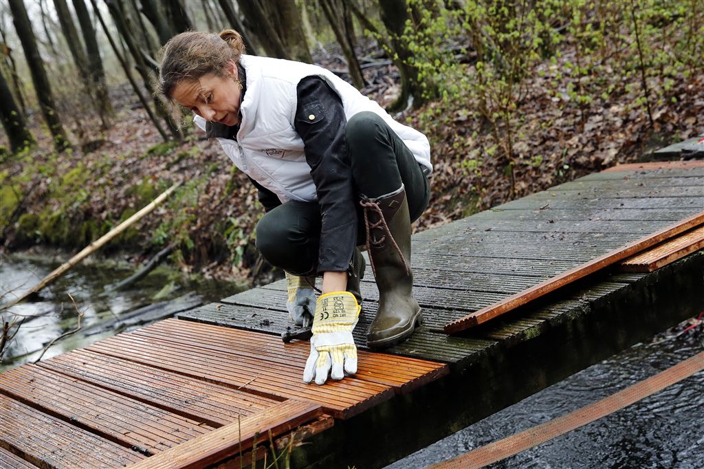 Ook werd er gesnoeid en pleegde Marilène onderhoud aan het natuurpad. Gehuld in rubberlaarzen en werkhandschoenen hanteerde ze een boormachine om nieuwe planken op een bruggetje vast te schroeven.