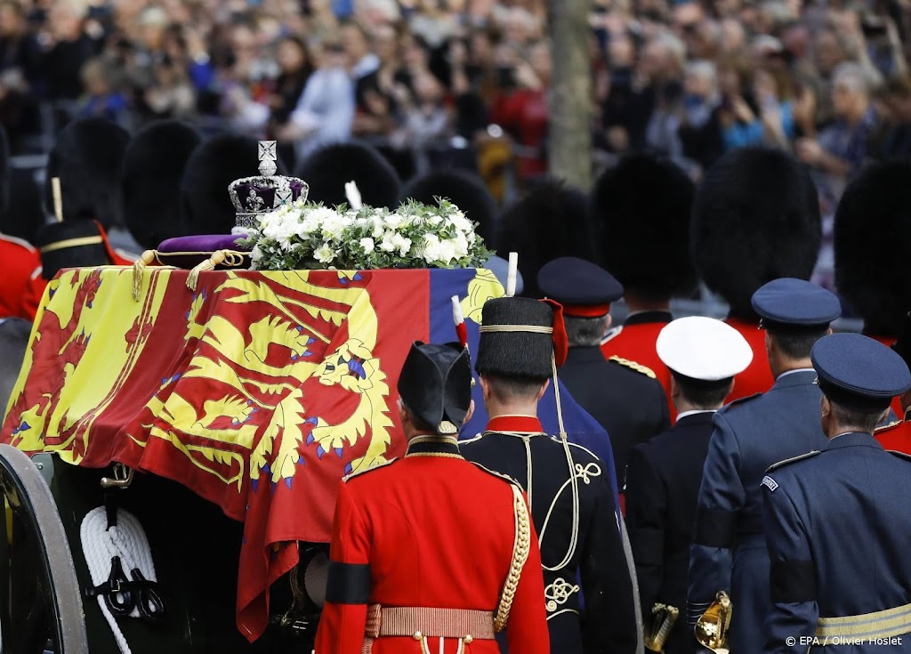 De processie van Westminster Hall naar Westminster Abbey is om 10.45 uur lokale tijd begonnen. De kist met koningin Elizabeth wordt naar de Londense kerk gebracht voor de uitvaartplechtigheid.