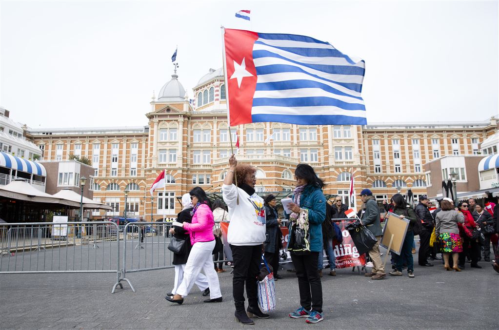 De Indonesische president Joko ‘Jokowi’ Widodo en zijn echtgenote zijn vrijdagmiddag bij paleis Noordeinde in Den Haag met gejoel, gezang en spreekkoren begroet door tientallen met Molukse en Papoea-vlaggen uitgeruste demonstranten.