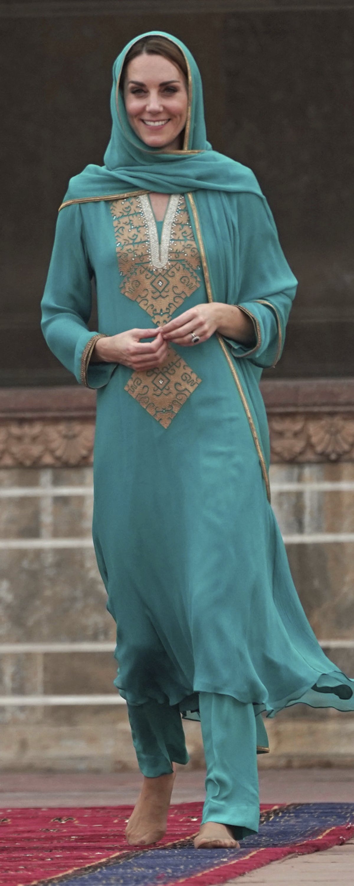 Een land waar je qua diplomatiek kleedgedrag ook vrij eenvoudig punten kunt scoren, is Pakistan. Wanneer prinse Diana in 1996 op bezoek komt, wordt haar garderobe met lange tunieken en broeken (de zogeheten shalwar kameez), sjaals en kleurrijk borduurwerk zelfs omschreven als een ‘masterclass mode’. De lat ligt dus hoog als William en Catherine in oktober 2019 een vijfdaags bezoek aan hetzelfde land brengen. Het paar laat zich daar niet door van de wijs brengen. Met veel enthousiasme tovert de hertogin de ene na de andere shalwar kameez tevoorschijn en de prins draagt bij het officiële diner een knielange jas en pantalon, een zogeheten sherwani. Als klap op de vuurpijl is de geste van de prins uitgevoerd in de nationale kleur van Pakistan: donkergroen. Over een masterclass mode gesproken!