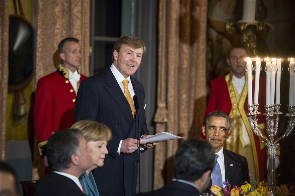 Willem-Alexander prijst de wereldleiders voor hun aanwezigheid bij de top in Den Haag. “Door uw aller aanwezigheid hier en uw persoonlijke commitment geeft u de wereld een heldere boodschap. Een boodschap van samenwerking over grenzen heen. Een boodschap van hoop op een veiliger leven”, aldus de koning.