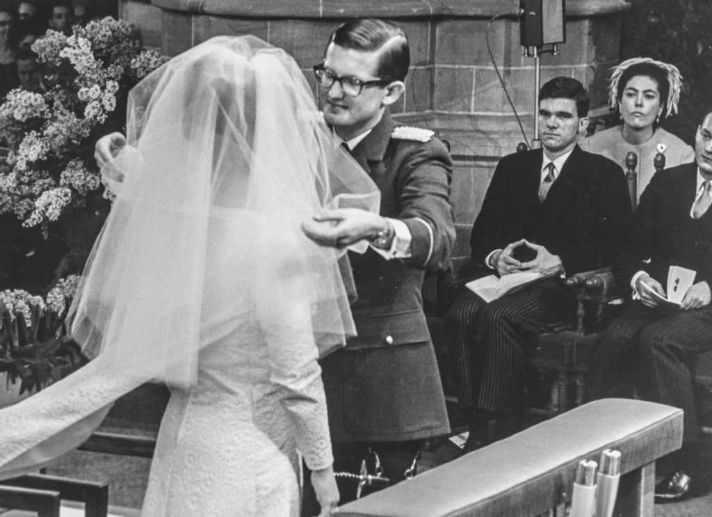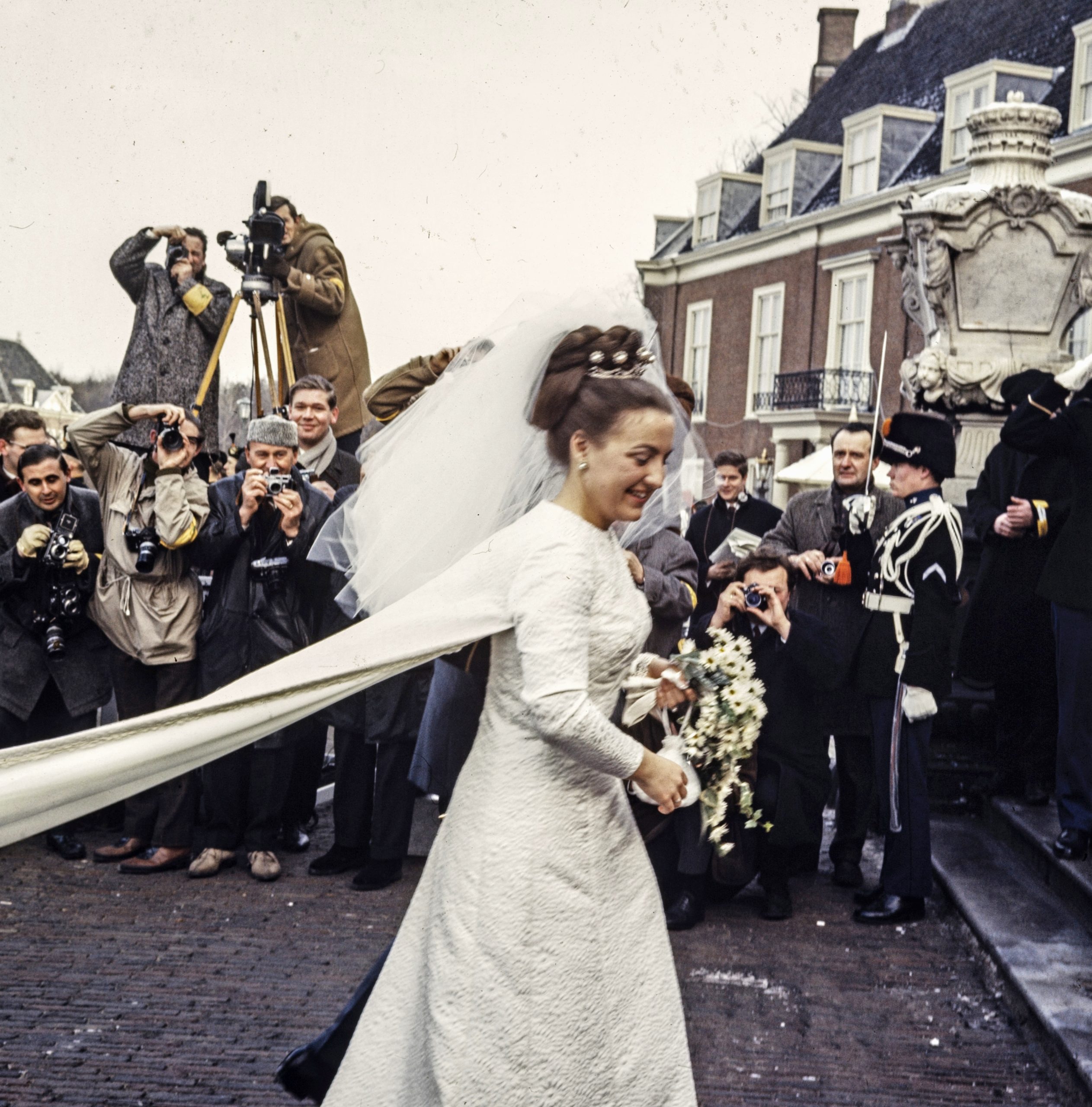 Een bruid die kiest voor een winterbruiloft, hoopt natuurlijk stiekem op een wítte bruiloft. En dat krijgt prinses Margriet. Negen dagen voor haar 24ste verjaardag trouwt de prinses met de 27-jarige Pieter van Vollenhoven, op een volgens het Polygoonjournaal gure en mistige dag die veel mogelijke toeschouwers heeft thuisgehouden. Het vriest op sommige plekken wel twee graden, waardoor de sneeuw van de afgelopen dagen nog op de daken en het gras ligt. Dampende paarden trekken het trouwrijtuig met de prinses en haar ‘burgerjongen’ van Paleis Huis ten Bosch naar de Grote of Sint-Jacobskerk, waar de kerkelijke inzegening plaatsvindt.