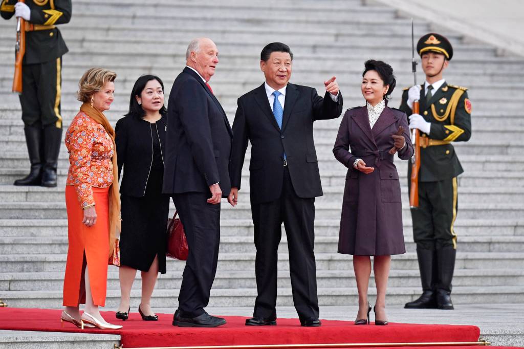 Met veel ceremonieel vertoon zijn koning Harald en koningin Sonja van Noorwegen dinsdag officieel welkom geheten in Peking. Op de zesde dag van hun Chinese staatsbezoek werd het koningspaar op het Plein van de Hemelse Vrede ontvangen door president Xi Jinping en zijn echtgenote Peng Liyuan.