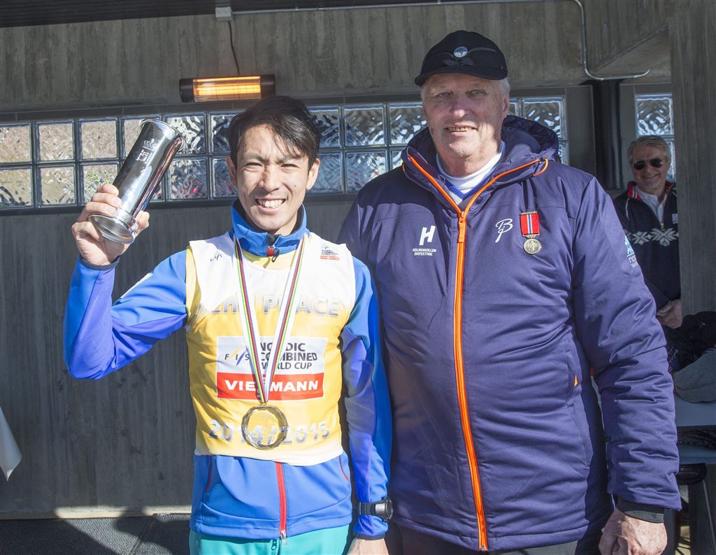 OSLO – Koning Harald en zijn zus prinses Astrid hebben zaterdag de World Cup Noordse Combinatie rond de skischans Holmenkollen bij Oslo bezocht. Na afloop van het ski-evenement ging de Noorse koning op de foto met de Japanse winnaar Akito Watabe.