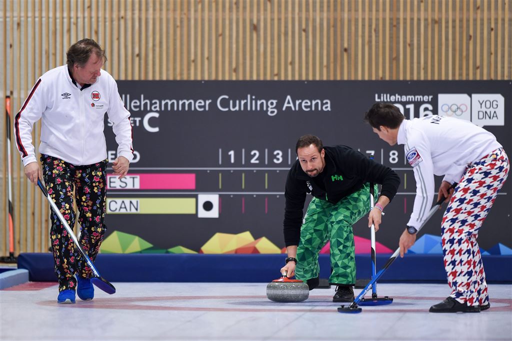 Kroonprins Haakon gooit eerste curlingsteen