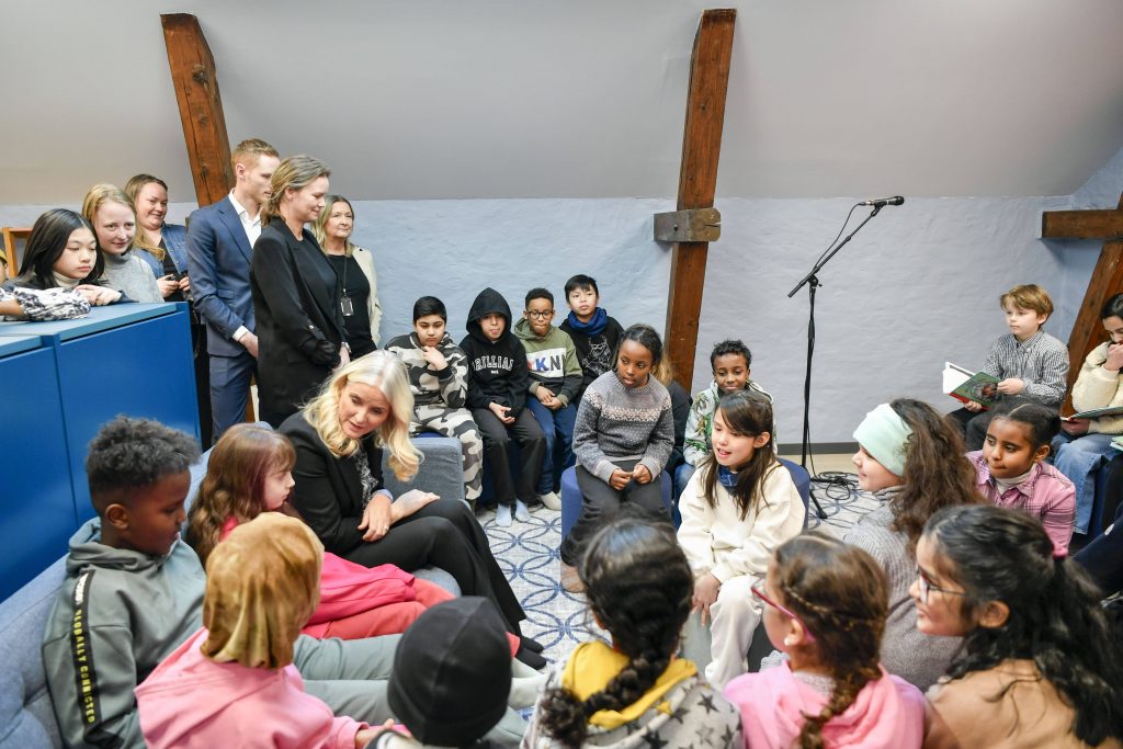 De Noorse kroonprinses Mette-Marit is dinsdag op een school in Oslo ontvangen door zingende kinderen. De vrouw van kroonprins Haakon bezocht de Vahl School in de Noorse hoofdstad voor het openen van de vernieuwde schoolbibliotheek.