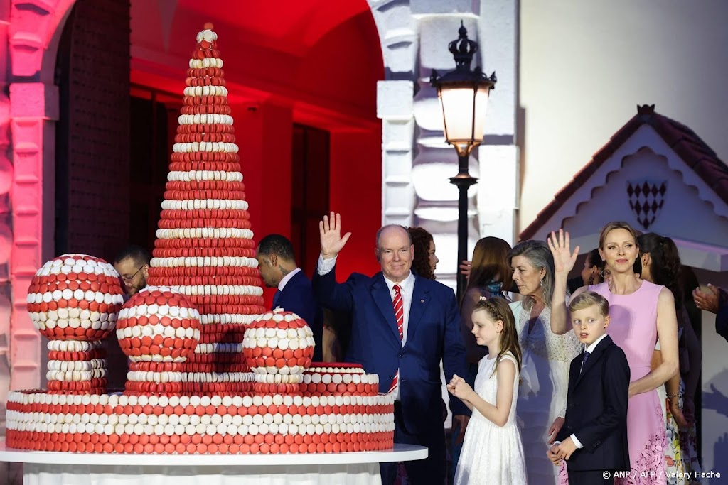 Met zijn gezin wandelde de prins over het plein voor het paleis om de aanwezige Monegasken te begroeten. Als verrassing droegen niet veel later zes bakkers de enorme, met rode en witte macarons versierde taart het podium op. Albert sneed hem zelf aan en stak na even geproefd te hebben goedkeurend een duim in de lucht.