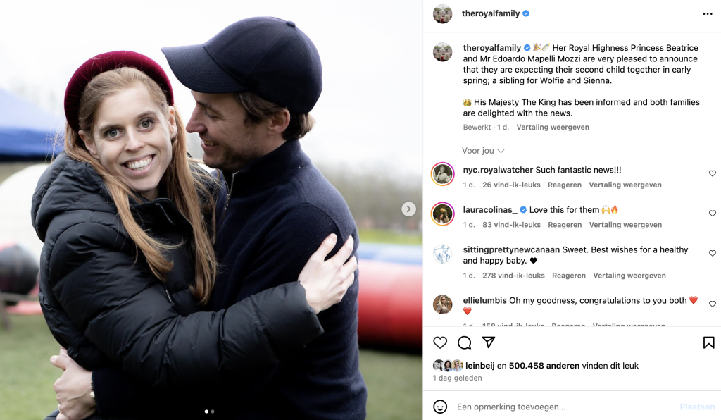 Koning Charles, de oom van Beatrice, is blij met het nieuws dat er “een broertje of zusje voor Wolfie en Sienna” komt. “Beide families zijn erg blij met het nieuws”, aldus Buckingham Palace.