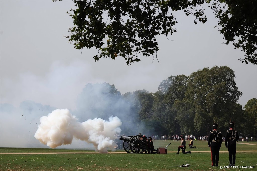 Militairen van King’s Troop Royal Horse Artillery vuren 41 schoten af. Op sociale media waarschuwt parkbeheerder Royal Parks mensen die hun honden uitlaten omdat het geluid “erg hard is en afschrikwekkend kan zijn”.