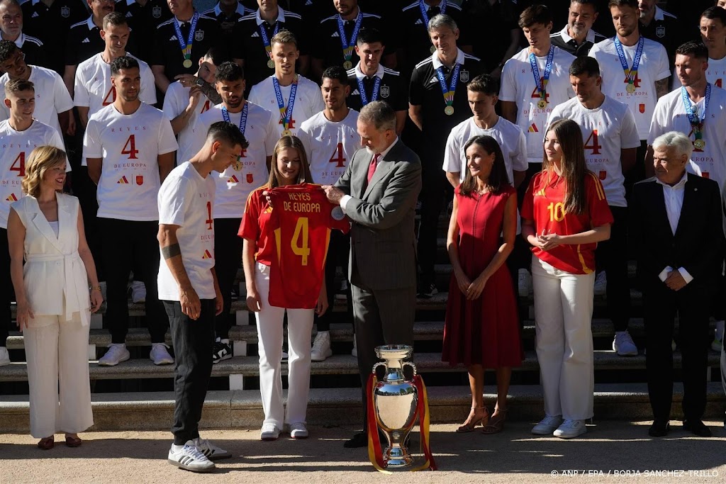 Het Spaanse nationale voetbalteam is maandag langsgegaan op het koninklijk paleis in Madrid. Koning Felipe, koningin Letizia en hun dochters Leonor en Sofía ontvingen het team en bondscoach Louis de la Fuente na hun winst op het EK.